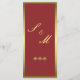 An elegant wedding menu of gold and red, with golden elements to add a touch of elegance and style to your wedding or other special occasion. Designer notes: everything can be completely customized, from the gold elements at the top of the menu to the wording of each course. Change (or even remove) if you wish. The reverse side of the menu shows the bridal couple monogram (which can also be changed or removed completely too).