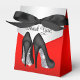 Red and black favor boxes with elegant black and silver high heel shoes on a beautiful red and silver background. This elegant red and black high heel shoe party favor box has text on the front flap and underneath the flap.