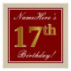 This simple and elegant birthday party poster design features a personalized message like "NameHere’s 17th Birthday!" (with the "17th" having a faux/imitation gold-like coloring look) within a red-colored square area featuring a simple border outline. The name is in an elegant white-colored script-like text, and can be customized. A personalised birthday party poster like this could perhaps be used as a decoration at a party being held for somebody who is celebrating their seventeenth birthday. [~Z0000234]