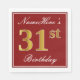 This simple and elegant paper napkin design features a message like "NameHere’s 31st Birthday" (with the "31st" having a faux gold-like coloring) within a red-colored square area featuring a simple border outline. The name is in a white-colored script-like text, and can be customized. Napkins like these could perhaps be used at a birthday party for somebody who is celebrating their thirty first birthday. [~Z0000138]