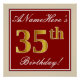 This simple and elegant birthday party poster design features a personalized message like "ANameHere’s 35th Birthday!" (with the "35th" having a faux/imitation gold-like coloring look) within a red-colored square area featuring a simple border outline. The name is in an elegant white-colored script-like text, and can be customized. A personalised birthday party poster like this could perhaps be used as a decoration at a party being held for somebody who is celebrating their thirty fifth birthday. [~Z0000234]
