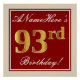 This simple and elegant birthday party poster design features a personalized message like "ANameHere’s 93rd Birthday!" (with the "93rd" having a faux/imitation gold-like coloring look) within a red-colored square area featuring a simple border outline. The name is in an elegant white-colored script-like text, and can be personalized. A personalised birthday party poster like this could perhaps be used as a decoration at a party being held for somebody who is celebrating their ninety third birthday. [~Z0000234]