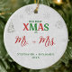 An elegant, white, red and green Christmas ornament for a newlywed couple with the title "our first Christmas as Mr and Mrs", featuring a pine tree and snowflakes covered in rhinestones and glitter (these are digital effects, not real stones or glitter!) and a shimmering, white winter background. The word XMAS, covered in rhinestones (digital also!) is a play on the traditional green and red. Modern, simple and elegant.