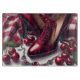 Vivid red high-heeled shoes accompanied by cherries and ornate jewelry, placed on a checkered fabric backdrop