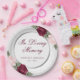 Elegant watercolor floral memorial/funeral paper plate featuring a botanical silver frame adorned with red and pink roses and baby's breath flowers. Matching items available.
