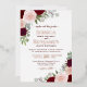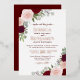 This beautiful wedding invitation features a rustic boho chic design with hand painted watercolor roses in shades of burgundy, red, and blush pink. The elegant script lettering includes highlights of real foil in a rose gold color. The back is a marbled burgundy color with a floral cluster of the same flowers.