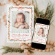 Share your joyful news with this holiday-themed birth announcement featuring your baby’s vertical photo framed by hand-painted red ribbon and watercolor greenery on a crisp white background. The baby’s name is displayed in whimsical red script with birth stats shown below, creating a festive design perfect for Christmas or winter announcements. The reverse side displays a second photo with space for a short message, offering a heartfelt way to celebrate your little one’s arrival with friends and family.
