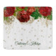 A beautiful watercolor image top border of red roses nestled among green foliage and gold embellishment makes this cutting board attractive for any kitchen. At the bottom is your custom text is in matching green. Everything is placed on a white background with subtle gold confetti.