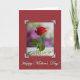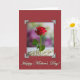 This greeting card centers on a single deep red flower with velvety petals opening toward the light, like it’s leaning in for a quiet moment ❤️. A slim green stem rises from the bottom, with two green leaves fanning out and adding a gentle contrast. Near the base, a strand of creamy, glossy round beads curls around the stem, giving the scene a soft, affectionate touch like a keepsake shared between close friends. Behind it all, the background is softly out of focus in muted greens with faint purple hints, so the flower stands out clearly. A wide, dark crimson border frames the image, textured with a subtle crosshatch that looks like woven fabric. Small silver-toned corner pieces sit at each corner, like photo mounts holding the picture in place. Along the bottom, a short line of flowing gold lettering sits centered beneath the image, with a slight shadow that helps it stand out 🌼. The gold text rests just above the lower edge of the deep red frame, aligned neatly under the flower and beads.