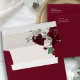 Burgundy floral envelope, with your return address on the front. The inside of the envelope is vintage cream with burgundy red and ivory roses, greenery and gold splatters. Please browse my Royal Rose collection for co-ordinating invitations, stationery and day-of-event decor.