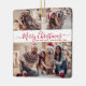 Modern Simple Elegant Calligraphy Red and White 3 Photo Collage Merry Christmas Script Ceramic Ornament. This festive, minimalist, whimsical three photo holiday Ornament features a pretty grid photo collage and says „Merry Christmas”! The „Merry Christmas” text is written in a hand lettered swirly swash-tail font script in red on white color background. On the reverse side one full photo with family name. Pretty keepsake for your family and friends in Christmas Holiday season.