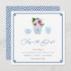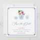 A classic "Save The Date" card design featuring red white and blue florals in a ginger jar vase with a "Greek Key" border and pattern backer. I've set the template up for a Save the Date for a wedding invitation but all of the text fields are customizable to your needs. You won't be able to edit the "Save the Date" font yourself. If you need this with other text, please send me a message. You can move, delete or add text fields by entering the design tool. You can also change the contrast color of the Greek Key border on the front and the pattern on the back (shown here as a dark blue) to any color you like by entering the design tool (underneath the text customization area, click to "customize further") then changing the background color on each side.