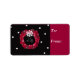 An elegant wreath in shades of red with a pretty white bow. A black background with white polka dots.