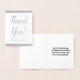 This elegant silver foil thank-you greeting card design features the message "Thank You!" on the front, along with a customizable message on the inside. It could be used to show gratitude to somebody who has done a special deed.