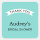Add a fresh, elegant accent to your wedding bridal shower favors with this robin egg blue square sticker. A charming white ribbon banner displays "Thank You" above the bride's name and "Bridal Shower" in classic black typography against a vibrant robin egg blue background. The clean, preppy design creates a polished and celebratory feel. Perfect for favor bags, gift boxes, or party accents. All text is fully customizable.