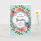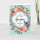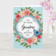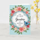 This greeting card features a calm sky-blue background that sets a gentle, affectionate tone ❤️. In the middle sits an off-white oval frame with a thin blue outline and ornate curling details, like a classic decorative plaque. Inside the oval, a Mother’s Day message is centered, with the main line in neat, easy-to-read lettering and a second line in larger, flowing cursive-style lettering, both in dark ink for contrast. A full wreath of flowers and leaves wraps around the frame, with coral, blush pink, and creamy blooms that lean toward each other as if sharing a quiet moment. Deep green leaves and small budding sprigs fill the gaps, giving the border a fresh, spring garden feel 🌼. On the right edge of the frame, a bright blue butterfly rests with wings slightly open, adding a soft sense of motion. The petals have lightly shaded edges and warm yellow centers, while the butterfly’s wings show fine vein lines and darker trim along the tips.