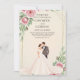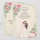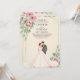 At the center of the design, a charming illustration of a bride and groom standing together in a romantic garden setting adds warmth, love, and storytelling to the invitation. The soft color palette and floral details make this design perfect for couples who want a dreamy, elegant, and memorable wedding theme.