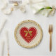 Happy Valentine's Day is written in a gold color text. Features a large red heart in the center, outlined with smaller hearts. It also has a faux gold color bow and the text wording. A romantic, elegant, faux gold vintage design makes up the outer plate edging. A festive, fun and romantic theme for your party or event.