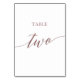 This elegant rose gold calligraphy table two table number is perfect for a simple wedding. The neutral design features a minimalist card decorated with romantic and whimsical faux rose gold foil typography. The card prints on the front and back (double-sided). Other table numbers in the collection are sold separately.