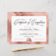 Elegant, trendy Certificate of Completion award course featuring faux foil rose gold background and handwritten calligraphy script ''certification of completion''. Personalize with course details and a name.