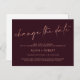 Modern elegant faux rose gold foil script red burgundy wedding change the date with a casual and cool script calligraphy to announce the postponement of your wedding and new plans