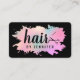 Modern business card with gradient faux rose gold, green & purple texture, scissors, black background and elegant calligraphy font.
