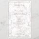Modern and elegant wedding program with your details in a faux rose gold, surrounded by a border, over a gray and white marble background. The headers are in an elegant script font. Add your ceremony events to the front and your wedding party to the back. This chic and stylish design is great for a celebration in the winter. These cheap wedding programs are printed on sheets of paper for a budget friendly option.