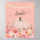 Enjoy this elegant, autumn, floral baby shower for a baby girl. Pinks, corals, and yellow florals with a blush pink background and "drinks" script above pumpkin. String lights at top and pink ribbon wrapped around pumpkin stem.