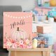 Enjoy this elegant, autumn, floral baby shower for a baby girl. Pinks, corals, and yellow florals with a blush pink background and "gift table" script above pumpkin. String lights at top and pink ribbon wrapped around pumpkin stem.