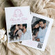 Announce your special day with elegance using this rose quartz photo save the date card. The front design features your custom monogram initials surrounded by a rose quartz floral crest on a crisp white background. Your names are beautifully displayed in rose pink calligraphy, followed by your wedding date and location. Below, include a horizontal engagement photo that adds a personal touch to your announcement. The back of the card features a vertical engagement photo with a QR code for easy access to your wedding website and any additional details.