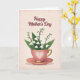 This card features an elegant rose-pink teacup on a matching saucer, trimmed with a shiny gold rim and handle that catch the light. On the front of the cup, a delicate heart motif in fine looping detail suggests a tender bond ❤️. White, bell-shaped blossoms spill from the cup like a fresh bouquet, their soft petals nestled among lush green leaves for a gentle springtime feel. The flowers lean slightly outward, as if reaching toward someone nearby, adding a quiet sense of closeness and care. Across the top, the words “Happy Mother’s Day” appear in a flowing, decorative style, set in a deep burgundy color that stands out against the background. Everything sits on a warm, pale pink backdrop with a subtle texture, keeping the scene calm and cozy 🌼. The gold accents along the rim and handle gleam softly beside the burgundy lettering at the top.