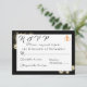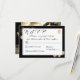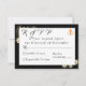 Design features an elegant black background with sepia roses surrounding a white rectangle displaying text. Text is displayed in the proper format for a response card. Back displays a large image of a beautiful sepia rose against a black background. A golden cross intertwined with two wedding rings is featured in top right corner. Gorgeous design is very pleasing to the eye.