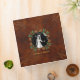Unusual Fall wedding album scrapbook binder done in digital graphics that give the background a rusted metal look. Lovely engraved looking decorative corners, with a round green, golden yellow, and rust floral wreath photo frame, in the center. An area below the frame looks like a raised plaque for the bride and groom's names. Personalize with your wedding photo and names for a truly unique wedding binder. Pages and inserts area sold separately.