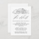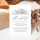 Rustic wedding details card featuring a black sketched illustration of a barn displayed at the top with a white background. The barn wedding details cards feature elegant black calligraphy elements throughout the design. Personalize the black and white barn details cards with important information such as hotel accommodations, group codes for discounted rates, transportation information, directions, welcome reception information, and your wedding website. Designed to coordinate with our Elegant Rustic Barn wedding collection.
