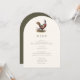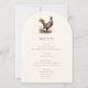 Arch shaped hunting themed dinner menu card with a pheasant illustration and elegant typography, dark olive green backer and custom text. Perfect for a country dinner, elegant wedding rehearsal dinner, hunting dinner, hunting retirement party or hunting birthday party.