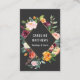 A beautifully elegant watercolor floral design surrounds an angular frame against a deep charcoal gray background in this unique vertical business card design. Flower colors include burgundy, pink, orange, rust, salmon, gold and off-white. Shown here as an event planner, the title and text may be edited with your business or personal specifics.
