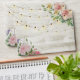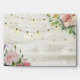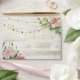 Wedding 5x7 Envelope Templates - Vintage Watercolor Pink Flowers and Elegant String Lights on Rustic Light White Wash Soft Wood Texture Background.
