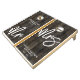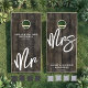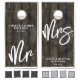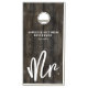 This custom wedding cornhole table set includes two matching boards, both designed with a dark rustic wood planks background for a warm and timeless look. Each board features crisp white fonts that stand out beautifully against the wood, creating a simple yet elegant design. Both display "Mr." and "Mrs." in playful handwritten script along with the couple’s last name, their full names, and the wedding date, making it a personalized piece for your celebration. Perfect for wedding receptions, cocktail hours, or backyard gatherings, this set adds a fun and memorable detail to your big day. All text and colors can be customized to match your wedding style.