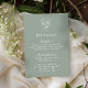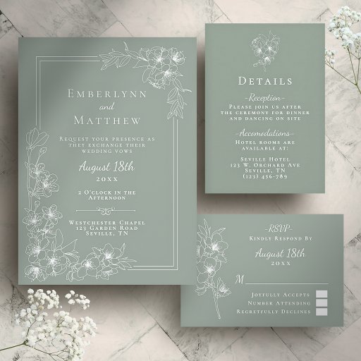 This sage green wedding details card features a modern elegant design of white line art flowers and and minimalistic typography. Use this details card for informing your wedding guests about your reception, hotel accommodations, or change the text to meet your needs. Perfect for spring summer and fall weddings with botanical or floral themes.