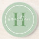 Elegant round personalized beverage drink coaster design features a classic custom serif monogram initial in leafy foliage green with your last name in modern white calligraphy script against a sage green background. A simple white circle frames the design. Color scheme can be customized to coordinate perfectly with your home decor.