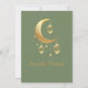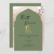 Design features a sage green mosque shaped frame with flowers in the background, with a moon and lanterns in the center.