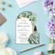Elegant and classy sage green with gold-tone accents floral bough combined with an arched white and gold-tone panel on a clear background "Quinceañera" party design. Features a dark brown to black-haired brunette beauty in a flowing sage-colored ball gown and a faux alcohol and ink marbled back. Composite design by Holiday Hearts Designs.