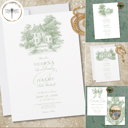 Make your wedding timeless with this elegant sage green vintage toile wedding thank you card design. Featuring a detailed manor and estate sketch by the water, it is perfect for a sophisticated ceremony. This classic look adds a refined touch to your historic home or garden celebration. Created by Simply Farmhouse Press.