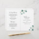 Elegant folded budget wedding program with a simple design featuring watercolor painted sage green eucalyptus greenery in the upper left corner and lower right corner. These rustic botanical wedding programs with a modern twist are perfect for a spring or summer wedding.