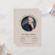 Minimalist memorial service or funeral invitation featuring a photo of your loved one inside a round frame. Beige funeral invitation with a round photo of your loved one and the invitation wording in a clean design. Elegant memorial service invitation personalized with a photo and In Loving Memory Of in curved text around the photo. Elegant funeral invitation for men in neutral colors.