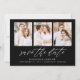 Announce your upcoming nuptials in style with our Elegant Script photo save the date card. The elegant save the date cards display 3 of your favorite engagement photos with "save the date" in a white modern calligraphy script against a black background. Personalize the card by adding your names, wedding date, and wedding location. The minimalist save the date card reverses to a solid black background or a color of your choice.