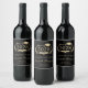 Elegant black and gold graduation party wine labels featuring "Class of" in an illustration of laurel wreath incorporating a grad cap and diploma, the graduate's name in a formal script, and "Congratulations" and their school name in modern classic typography.