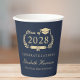 Elegant dark blue graduation party paper cups featuring "Class of" in a light gold illustration of laurel wreath incorporating a grad cap and diploma, the graduate's name in a stylish light gold script, and "Congratulations" and their school name in modern light gold typography.