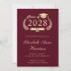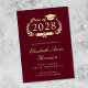 Modern burgundy red college graduation announcement featuring "Class of" in a light gold illustration of a laurel wreath with a grad cap topper and diploma and the graduate's name in an elegant light gold script. Add their school, major, honors or future plans.