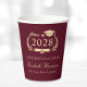 Elegant burgundy red graduation party paper cups featuring "Class of" in a light gold illustration of laurel wreath incorporating a grad cap and diploma, the graduate's name in a stylish light gold script, and "Congratulations" and their school name in modern gold typography.